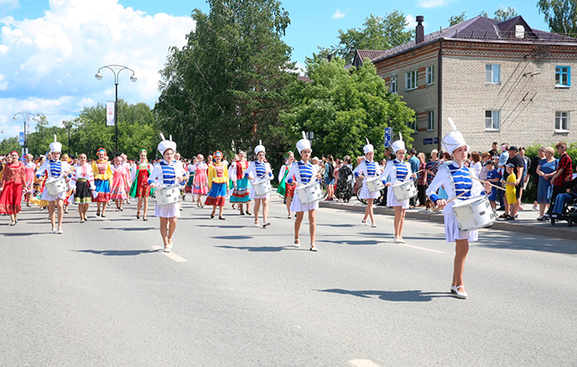 День города прошел на 15 площадках. Несколько тысяч тоболяков приняли участие в общегородском костюмированном шествии в юбилей города. Во главе шествия шли воспитанники военно-спортивного молодежного центра «Россияне» с тремя гербами Тобольска разных эпох. Далее - колонна «Тобольск настоящий». Каждую тематическую колонну открывали артисты Тобольского театра драмы в тематических костюмах. В шествии также был парад невест, парад собак клуба «Лидер» и все желающие тоболяки.
