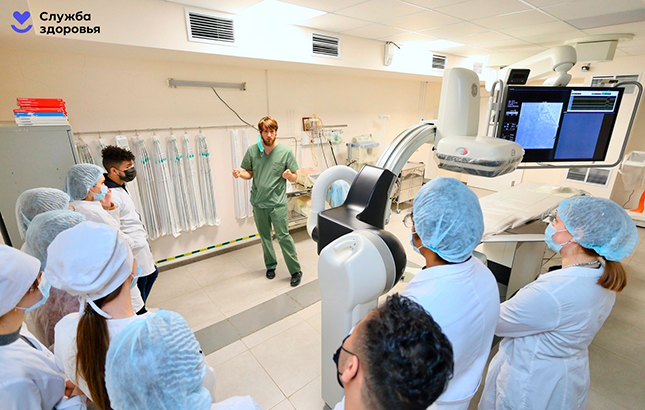 Учащиеся оценили условия труда в поликлинике и пообщались с узкими специалистами. В отделении для пациентов с острым нарушением мозгового кровообращения студентам показали работу новейшего оборудования для медицинской реабилитации, а эндоваскулярный хирург рассказал о лечении пациентов с сосудистой патологией с помощью ангиографа последнего поколения.
