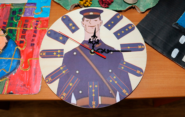 Участники представили на конкурс поделки, выполненные в различной технике. Мальчишки и девчонки проявили фантазию и креатив. Алихан Альжанов сшил куклу сотрудницы полиции. С выкройкой ему помогала мама – вместе они одели куклу в форменное платье и пилотку. Софья Субарева создала мозаику, сначала она нарисовала героя всеми любимого рассказа Дядю Стёпу с сидящей у него на плечах девочкой, а затем разделила рисунок на части, которые в последующем необходимо соединить воедино. Азисов Роман сконструировал настенные часы, цифры которых заменены на погоны сотрудников полиции, начинающиеся со звания прапорщик полиции и доходящие до звания – генерал-лейтенант. «Эти часы символизируют то, что каждый сотрудник должен стремиться к повышению навыков своей работы, добиваться высоких целей и получать за заслуги новые звания», - поделился своими мыслями Роман.